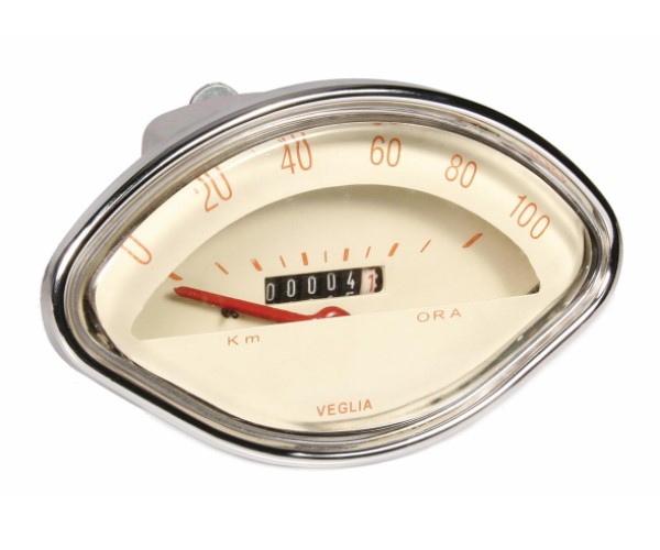Speedometer 100 KM/H Clam Shell Shaped for Vespa 150 VBA, VBB, VGLA-B, GL Features beige face with red numbers, chrome surround. No Piaggio logo Cable connection 2,7mm Budget unit for a decent repair